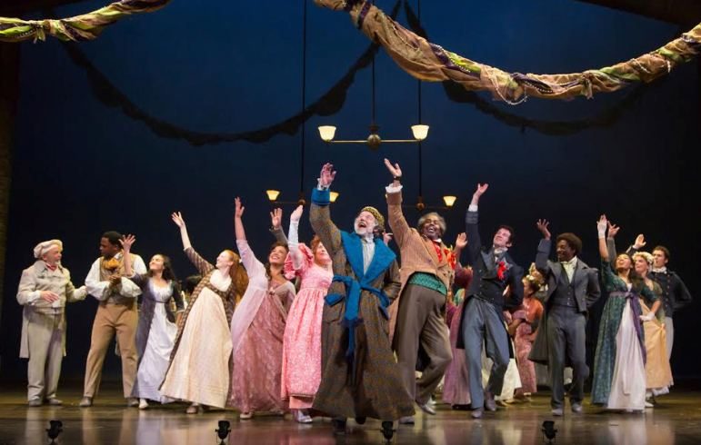 The basic 25-person cast is augmented, at times, by many more actors, from a community ensemble and a children’s ensemble. The sheer number of people onstage helps create a sense of holiday-season hustle and bustle, especially at the party thrown by the perpetually jovial Mr. and Mrs. Fezziwig (played by Lance Roberts and Anne L. Nathan).