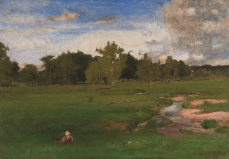 Many of the works in “American Visions” were done in the artists’ colonies that sprang up around the United States in the decades that the exhibition covers. Colonies in Massachusetts, Connecticut, Illinois, Missouri, New Mexico and California are represented; a map on one wall of the museum’s gallery shows where they are all. New Jersey is represented by George Inness and George Inness Jr., of Montclair. (The museum has a large collection of Inness paintings, and displays them year-round in its George Inness Gallery.) In Inness’ peaceful “Meadowland in June” (1880), a lone figure in the bottom left corner of the scene is dwarfed by the vast expanse in front of him.