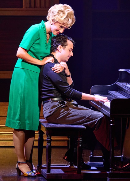 Kirshner (Bryan Fenkart) doesn’t sing — except for a little bit on the sentimental “You’ve Got a Friend” — and is portrayed as a bit of a con artist, but mostly a mensch. King’s mother Genie (Suzanne Grodner) is little than a Jewish mother stereotype, loving but overbearing.