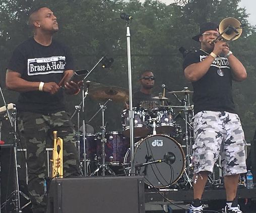 From left, Tannon Williams, Reginald Nicholas and Winston Turner of Brass-a-holics, at Crawfish Fest.