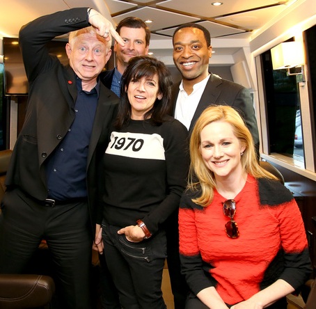 Clockwise from left: “Love Actually” director-writer Richard Curtis with Montclair Film Festival board member Luke Parker Bowles, “Love Actually” co-stars Chiwetel Ejiofor and Laura Linney and, center, Curtis’ partner and “Love Actually” script editor Emma Freud, at the Montclair Film Festival on April 30.