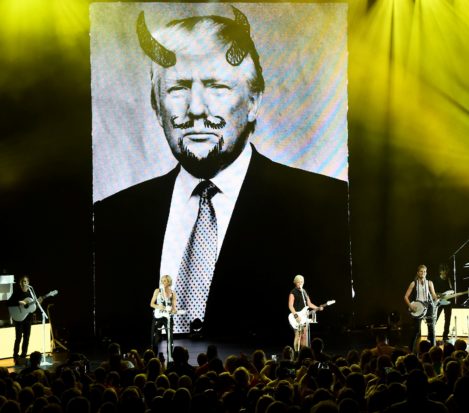 A defaced imaged of Donald Trump looms over The Dixie Chicks as they perform in Cincinnati on June 1.