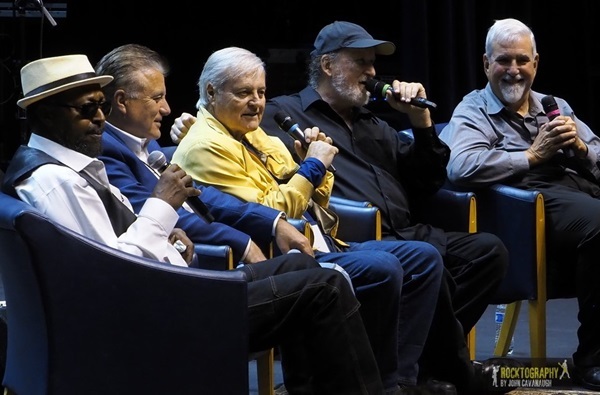 From left, Bruce Springsteen, Garry Tallent, David Sancious, Vini Lopez and moderator Tom Cunningham participate in a panel discussion at a symposium celebrating the 50th anniversary of the album “The Wild, the Innocent & the E Street Shuffle” at Monmouth University in West Long Branch, Oct. 28.