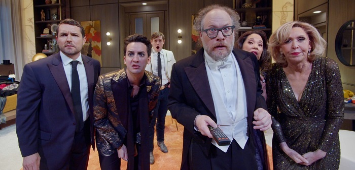 From left, Zach Shaffer, Greg Cuellar, Doug Harris, Andy Grotelueschen, Christine Toy Johnson and Julie Halston co-star in “It’s Only a Play.”