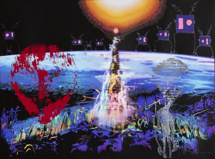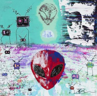 Guitarist Joe Satriani, whose interest in science fiction is reflected in the titles of his instrumental rock albums (Surfing With the Alien, Is There Love in Space?, Shockwave Supernova, etc.), demonstrates an interest in the future, and the world of imagination, in his artwork, too. Check out his “Purple Species and Friends,” above, and his “Alien Party,” to the right.