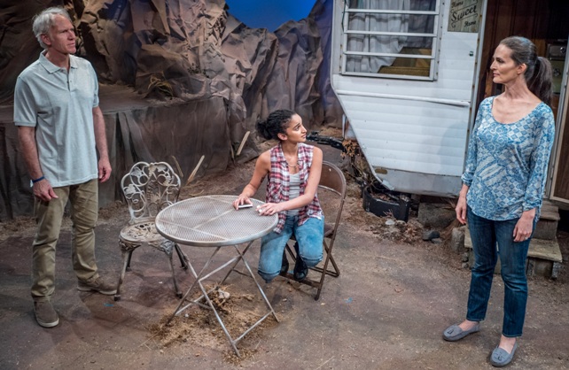 The play — which is being produced after being selected from more than 400 submissions in Premiere Stages’ 2016 Play Festival — starts with Sheridan (played by Brian Sutherland) arriving at a rather shabby-looking trailer in the middle of nowhere, at night, with coyotes howling in the distance. It’s pitch black, and he has a flashlight with him. Someone is already living in the trailer, though — a 16-year-old girl named Soledad (Diomargy Nuñez) — but she scurries off, apparently not having any right to be there in the first place.