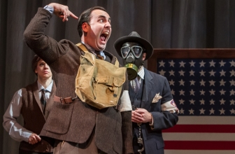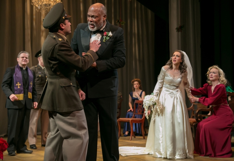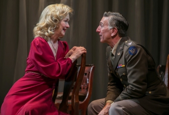 Director Scott Wentworth (who also plays Benedick) moves the action from summertime in the 16th century to Christmas time during World War II; by doing so, he turns one of Shakespeare’s sharpest comedies into feel-good holiday fare, complete with mistletoe and a Christmas tree on the stage, Bing Crosby singing “White Christmas” on the radio, and even Shakespeare’s “Sigh No More” song delivered as if it were a Christmas carol.