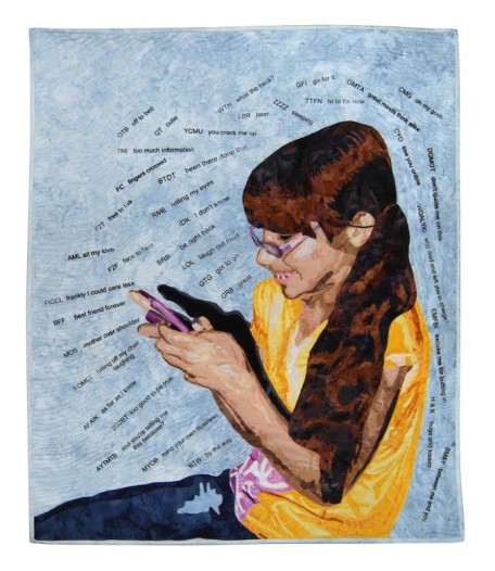 It’s a weird juxtaposition for many reasons — mainly, perhaps, because it’s so quick and easy to send a text message, and such a complex, time-consuming process, in comparison, to make a quilt. But there is a long history of using quilts to convey written messages, so it’s really not that much of a stretch. And if it gets some cellphone-focused teens curious about art … that’s obviously a good thing, too.