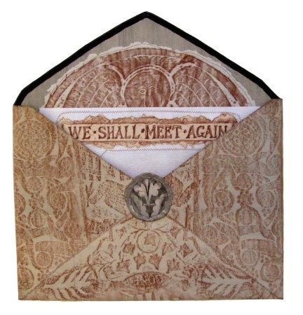 One of the most inventive — and haunting — pieces is Susan Lenz’s “Texting From the Grave,” which pictures an open envelope with the message “We Shall Meet Again,” looking as if it were written on a tombstone, visible inside.
