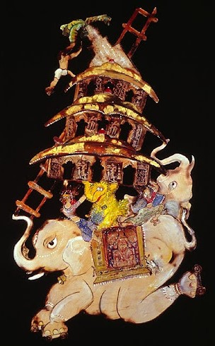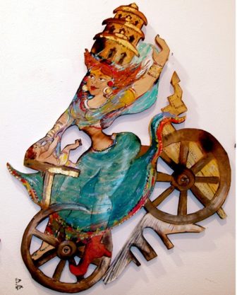 Her art utilizes both traditional Indian images and images taken from American culture (Big Bird, from “Sesame Street,” and Spider-Man both show up with surprising frequency). It often depicts women in motion, negotiating the many demands made on them with grace.