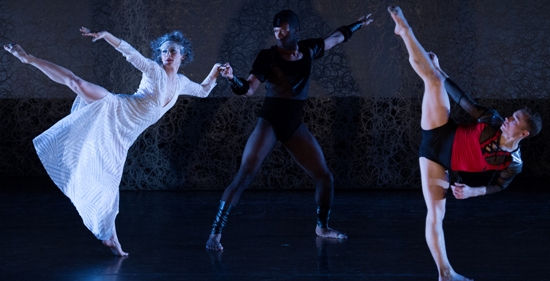 A curious child exploring this terrain can still make friends, however; Lucy soon strikes up a “conversation” with the playful faun called Mr. Tumnus. The choreographer’s style here is sinuous and fluid. As Lucy, dancer Monica Gonzalez sweeps in circles and darts, evincing curiosity and taking possession of the space. Robert Mark Burke, as Mr. Tumnus, observes her with a sparkle in his eyes, and they begin a teasing game in which she rolls off his back and flips over his arm. Mr. Tumnus gives Lucy a blindfold that enables her to see a trio of dancing Nymphs, who conjure over the girl when she falls unconscious. Mr. Tumnus, it seems, is not entirely to be trusted. But he repents, and sends the Nymphs away.