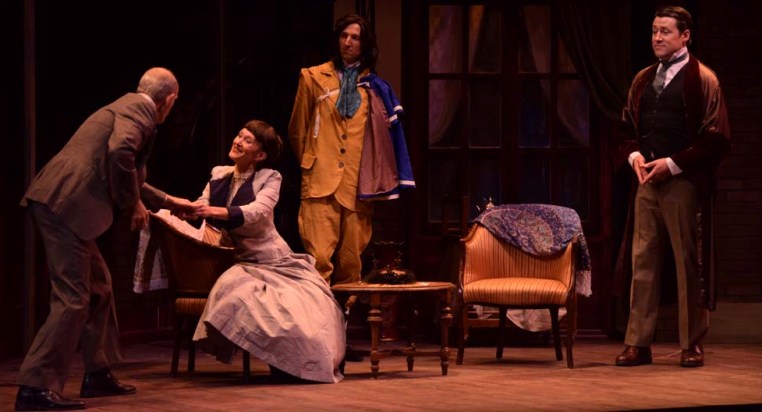 From left, David Sitler as Dr. Watson, Sandy York as Lillie Langtry, Joseph McGranaghan as Oscar Wilde and Colin Ryan as Sherlock Holmes in “Sherlock Holmes and the Case of the Jersey Lily.”