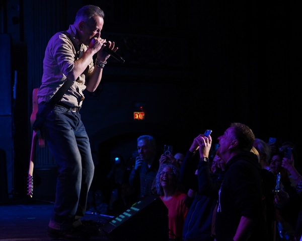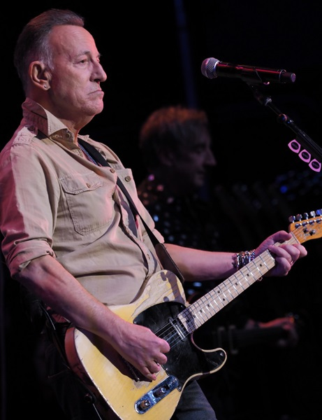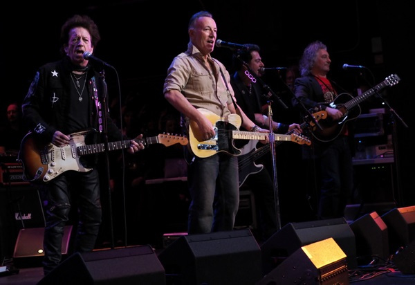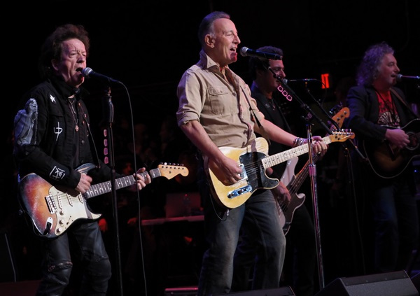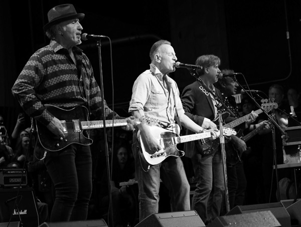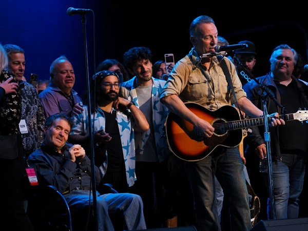 Bruce Springsteen performs “Thunder Road” at The Count Basie Center for the Arts in Red Bank, Jan. 18. He is joined by Light of Day founder Bob Benjamin, at bottom left, Light of Day Foundation president Joe D’Urso, at far right, and others.
