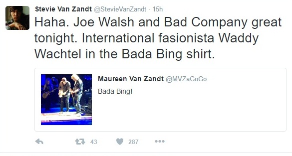 Van Zandt’s wife Maureen Van Zandt noticed that Walsh’s guitarist, Waddy Wachtel, happened to be wearing a Bada Bing T-shirt (referring to the fictional go-go bar in the series “The Sopranos,” which both Van Zandts acted in), and tweeted about it at @MVZaGoGo, prompting the response by Steven (@stevievanzandt) at the left.
