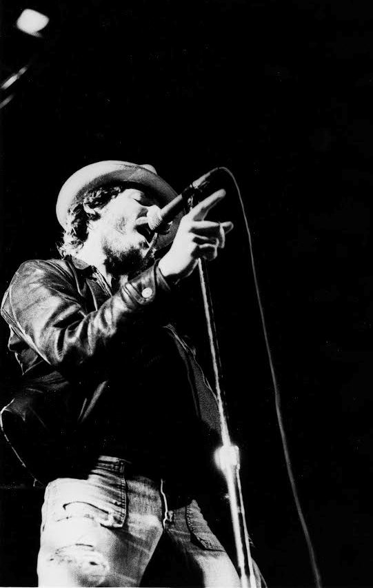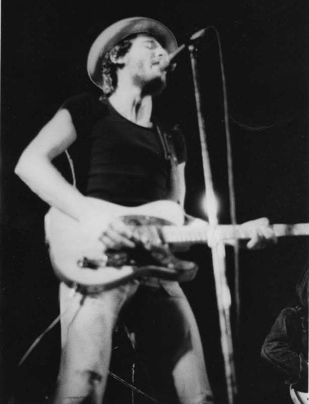 Bruce Springsteen is shown performing, here and in the other black and white photos in this post, at the Panzer Gymnasium of Montclair State College on May 4, 1974.